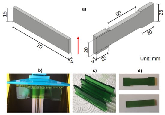 Printed specimens: (a) shape and dimensions, the red arrow shows the direction of the layer growth during printing, (b) the specimen after printing, (c) the specimens after post-process washing, (d) the specimens after post-curing.