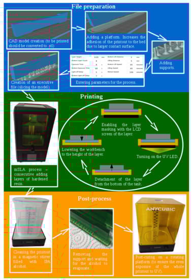 Stereolithography (SLA) is historically the first used additive manufacturing (AM) process [1,2]. This technique is characterized by the smallest number of process parameters. It guarantees an excellent quality of the print surface compared to other AM techniques. It consists in hardening the photopolymer in a liquid state, with the use of ultraviolet (UV) light. The polymerization process consists of twostages. Initially, gelation occurs, which is the process of creating an infinite molecular network [3,4]. Then, the vitrification process begins, i.e., a gradual thermoreversible process of the formation of a glassy material [5,6]. The printed “green” element consists of the following two phases: gel and sol. The printout is anisotropic, due to the additive nature of the process [2,5]. A problem occurs in reaching the inner areas of the printout, by UV rays, which is necessary to cure the sol phase. A properly long exposure time leads to polymerization of unlit areas, due to a chain reaction that is maintained by the large amounts of photoinitiators added to the resins that are used in SLA technology [5]. Initially, a UV laser light source was used for curing the polymers. In recent years, however, devices using light electric diodes (LED) have appeared. Devices of this type use LED matrices to harden the appropriate tracks in the resin, producing a properly pathed layer. This technique is referred to as mask stereolithography (mSLA) [1,2]. This process quantizes the produced object to cuboids, with sides corresponding to the pixel size and the thickness of the hardened layer [1,2,5]. The mSLA technique is used, among others, for printing biomaterials [7], metamaterials for mechanical applications [8], and elements for microelectromechanical systems (MEMS) [9].