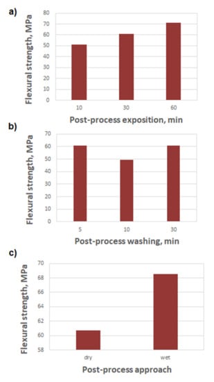 Flexural strength of printed samples, depending on the following: (a) post-curing exposition time, (b) post-process washing time, (c) post-process approach—post-curing in water shielding.