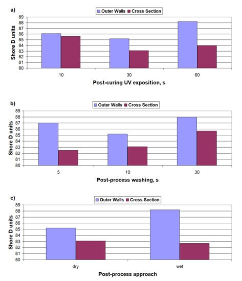 Shore D hardness of printed samples, depending on the following: (a) post-curing exposition time, (b) post-process washing time, (c) post-process approach—post-curing in water shielding.