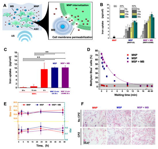 Iron uptake in sonoporated cells. (A) Diagram of the working principle of magneto-sonoporation (MSP) using ultrasound (US) in combination or not with microbubbles (MBs) to increase cell membrane permeability. (B) To optimize the sonoporation procedure, the cells underwent sonication with different duty cycles for different time ranges at 1.0 W/cm2. Other power intensities were also tested (data not shown). (C) The magnetic nanoparticles (MNP) uptake was compared among cells undergoing simple incubation for different time ranges (30 s, 15 min, 6 h), or upon sonication in the presence or absence of MBs (MSP and MSP + MB, respectively). ** p < 0:01. (D) In order to estimate the resealing time of the cell membrane after sonication, the cells were subjected to the Methylene Blue Permeability assay. Cells positive for the dye were considered to have altered membrane permeability and their fraction over the total population was plotted against time. (E) The stability of MNPs in culture media following MSP in the presence or absence of MBs was assessed by monitoring the mean hydrodynamic diameter (size, nm) and polydispersity index (PDI) via dynamic light scattering (DLS) over time, after dilution into cell culture media and maintenance in cell incubation (37 °C, 5% CO2 and pH 7.4). (F) Internalization of MNPs shown by Prussian Blue staining of ASCs after conventional incubation (6 h), MSP or MSP with MBs (15 min) in the presence or absence of the endocytosis-inhibitor chlorpromazine (CPZ). Equivalent volumes of phosphate-buffered saline (PBS) in the culture medium were used as controls (unlabeled).