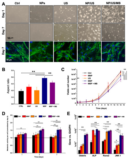 Biological effects. (A) Cell morphology was observed in phase contrast microscopy and in fluorescence microscopy (actin displayed in green, nuclei in blue). (B) Aspect ratio of cells was calculated one week after the various treatments. (C) Proliferation rate of ASCs measured as viable cell numbers over time. (D) Metabolic activity per cell in the different conditions, normalized to the DNA content, relative to day 0. (E) Gene expression of ASCs one week after sonoporation, focused on the expression of genes involved in osteogenesis and mechanical transduction. Asterisks indicate significant difference (by two-way analysis of variance (ANOVA)): * p < 0:05; ** p < 0:01. MNP = magnetic nanoparticles; US = ultrasounds; MB = microbubbles. MSP = magneto-sonoporation.