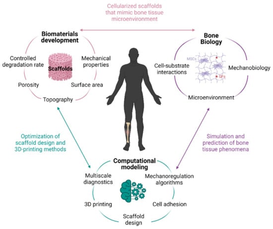 Regulation of 3D scaffold properties allow the selective guidance of cell development and differentiation in bone tissue. Moreover, computational modeling has emerged as an excellent tool to predict and optimize the clinical potential in terms of cell proliferation and differentiation, tissue growth, adaptation, and maintenance []. Thus, a proper understanding of the molecular mechanisms involved in cell–biomaterial interactions will allow one step forward in the achievement of functional advanced biomaterials for tissue engineering (Figure 1).