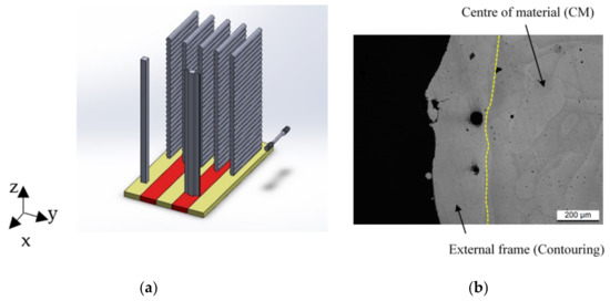 (a) Job of SL (yellow region) and DL (red region) AlSi10Mg 90-samples; (b) Optical microscope micrograph which shows the bar cross-section (⦿ Build direction).