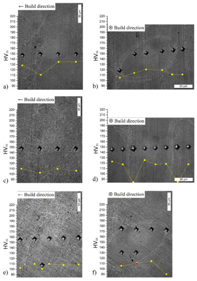 Vickers microhardness profiles (yellow and red curves) of as-built AlSi10Mg 90-samples (a–d) and 50-samples (e,f) performed in XZ (a,c,e) plane and XY plane (b,d,f).