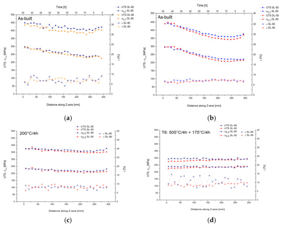 Figure 6 presents the tensile properties of AlSi10Mg samples in as-built condition (Figure 6a,b) after the DA at 200 °C/4 h (Figure 6c) and the T6 HT (Figure 6d) were analyzed along the build direction.