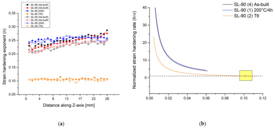 Figure 8a shows the strain hardening trends in function of the Z-axis considering the as built and the heat-treated 90-samples and 50-samples. Generally, the as-built samples are characterized by an increase of n values with increasing distance from the preheated build platform. This behaviour can be explained through the possible increase of high-density defects or dislocations as previously reported by the argumentation of the residuals stress [75]. Sjögren et al. [76] study the effective correlation between the dislocation movements and the strain hardening exponent (n), which increases with the increase of the multiplication and entanglement of dislocations. Moreover, the 90-samples show higher strain hardening exponents than the 50-samples, which tends to homogenize only after the DA at 200 °C/4 h. Also considering the top and the bottom region, the n values tend to stabilize due to the possible loss of the effects induced by the preheated build platform as reported in [23]. In detail, the DA can be induced by an increment of the precipitation phenomena both in top and bottom regions, and it can be considered as a stress relief HT for the top regions. In fact, the n values decrease with the possible decreasing of the dislocation density, as also reported by [77]. Finally, the n values decrease in all samples which were T6 heat-treated according to a decrease in the variation between the yield strength and the UTS values for each analyzed sample [78].