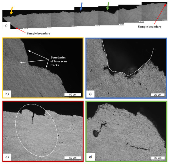 The same results are obtained by Paul et al. [44] through the analysis of AlSi10Mg SLMed samples manufactured using different scan strategies. Focusing on Figure 9c, the white dotted line highlights a semi-ellipsoidal shape of the fracture profile, and observing the presence of the heat-affected zone, it can assume the presence of a laser scan track before failure of the sample. On the other hand, the cracks also propagated within both the molten pool (Figure 9d) and the laser scan tracks (Figure 9e), but the heat-affected zones remain the preferential areas of propagation.