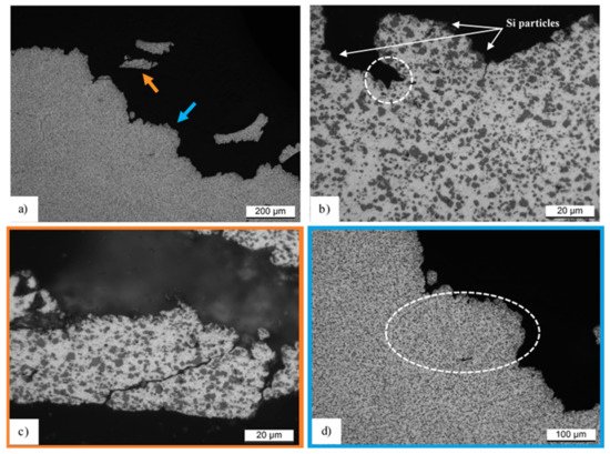 The fracture profile of the T6 heat-treated sample (2) is shown in Figure 10a, where the orange arrow indicates a piece of fracture surface incorporated in epoxy resin (black areas). Also for this sample, the voids nucleate at the Si particles through the de-cohesion with the Al-matrix (Si particles show in Figure 10b); consequently, the void coalescence can occur as highlighted by the dotted circumference in Figure 10b, and the crack can propagate, as observed by Aboulkhair et al. [29]. During the tensile test, the crack propagation occurs, interconnecting the voids previously mentioned. In other words, it advances among the Si particles (Figure 10c). At the same time, the cracked Al-matrix is also observed in Figure 10c. Focusing on the optical microscope, the micrograph in Figure 10d shows the white dotted ellipse highlighting the possible presence of a molten pool before the T6 HT (see Figure 4c). In this context, it is possible to observe that the molten pool and the laser scan tracks, which remain after the HT as discussed in Section 3.1., can influence the fracture mechanisms. In fact, at their boundaries there is a greater presence of Si particles than at their center, so there are more possibilities that all voids can be interconnected by a crack, as reported by Zhao et al. [80].