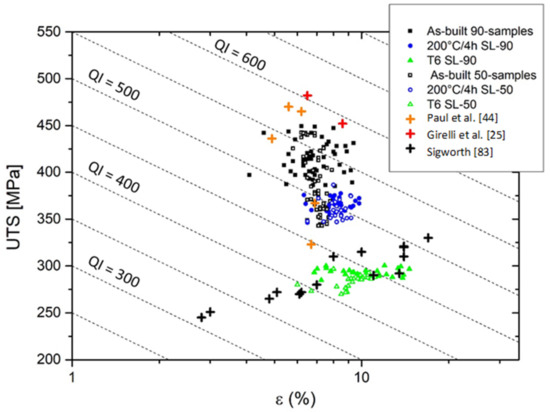 where UTS is the ultimate tensile strength and d is an empirical parameter which is determined, as suggested by Drouzy et al. [82], to make QI independent of the yield strength, and ε is the engineering elongation to fracture. In this context, it is possible to observe that the as-built 90-samples and 50-samples are characterized by higher QI values (between 480–580 MPa) than the direct aged at 200 °C/4 h (between 460–525 MPa) as shown in Figure 11.