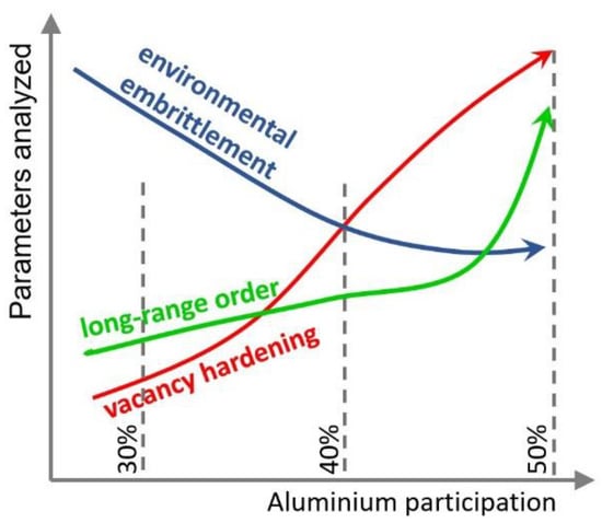 The nature of the influence of all three causes strongly depends on the content of aluminium in the alloy. Figure 1 shows changes in individual parameters as a function of aluminium content. It is seen that these changes are not linear. Studies have shown that environmental brittleness decreases with increasing aluminium content to 50%. This behaviour is most likely due to the formation of a protective Al2O3 layer, which makes contact with water vapour difficult. In alloys with aluminium contents over 40%, the influence of hydrogen embrittlement is insignificant. Unfortunately, instead of falling, the brittleness of these alloys increases even more for two other reasons: the degree of order and the strengthening by vacancies. Hence, the most popular alloys have an aluminium content of approx. 40%, the plastic properties of which seem to be optimal.