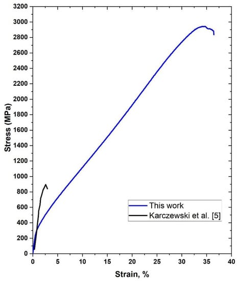 In Figure 8, the obtained tensile test diagrams are compared with the results of the compression tests. In Table 4, the obtained mechanical properties are compared. As you can easily see, the difference is large. When tension occurs, the samples break even at a deformation of less than 2%, which means that they behave similar to a brittle material, as is known from the literature. An almost 10-fold decrease in endurance occurs. The obtained results closely correspond to the micro- and macrostructural observations presented in Figure 9.