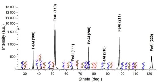 The basic study was qualitative X-ray diffraction phase analysis of the samples after homogenisation, and the results are shown in Figure 3. The FeAl phase is dominating in the pattern. The presence of the peak from plane 100 (angle 36°) confirms that it is an ordered intermetallic phase and not a solid solution. Only a slight presence of iron oxides (Fe2O3) and aluminium (Al2O3) was identified. Although no quantification has been performed, the peak difference with the highest intensity indicates a trace of oxides. The intensity of the reflections from both oxide phases is approx. 1% of the intensity of the peak (110) FeAl. The small proportion of oxides is consistent with previous studies of the presence of oxides in PAIS sinters.