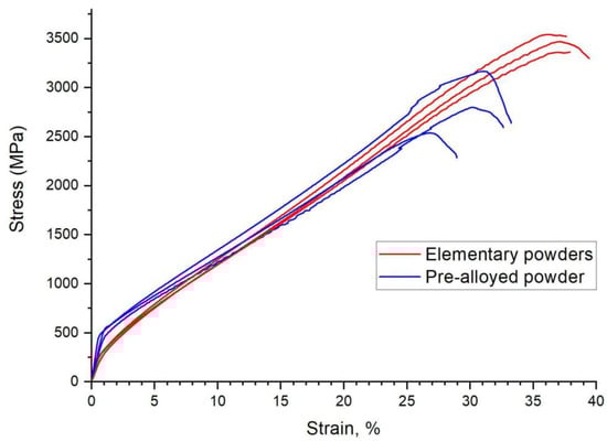 Comparison of strain-stress relationships of specimens obtained from elementary powders (red) and pre-alloyed powders (blue).