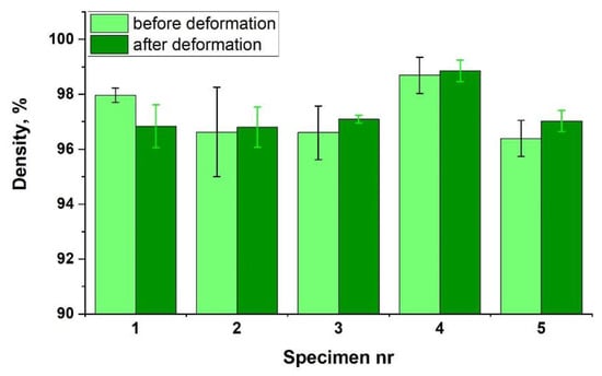 Theoretically, porosity can also be one of the causes of increased plasticity. The presence of voids in the sintered material may facilitate the displacement of the grains, resulting in an increase in plasticity. To check this effect, density tests of five samples were performed. The obtained results are presented in Figure 5 (light green). The density of the obtained materials is very high and is in the range of 96–98% of the theoretical density of Fe40Al. A porosity of 2–4% cannot increase plasticity so much. However, to completely rule out this cause, an additional experiment was performed. Samples that were subjected to density tests were subjected to a compression test, and then their density was measured again. If the above-described mechanism takes place, deformation during the compression test should significantly reduce the porosity (increase the density). The obtained results are presented in Figure 5, in dark green. No significant increase in density occurred. The performed statistical test (t-test) showed that in all cases, the differences between the results were not statistically significant (Table 3). Thus, porosity was proven not to cause the high plasticity of the tested sinters.