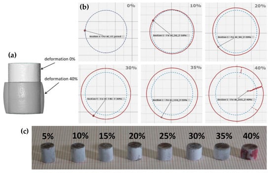 It was also decided to check whether the samples retained their integrity during deformation. The occurrence of cracks or microcracks along the grain boundaries may cause the grains to move relative to each other. The total effect of this displacement may be similar to plastic deformation. It was decided to exclude this effect by two methods. First, scans of deformed samples were performed using a computer tomograph. Figure 6a shows the changes in the outer contours of a sample. The sample behaves similar to a typical ductile material. As the height decreases, the diameter of the sample grows and becomes barrel-shaped. Figure 6b shows selected sections obtained at half height (the remaining sections are presented in Appendix B). The cross section of the current sample is marked in red, while the initial diameter is marked in blue, i.e., the diameter of the undeformed sample. Cracks were detected only in the sample deformed by 40%. Identical results were obtained using the second method—the penetrator method (Figure 6c). Additionally, only in this case did the specimen deformed by 40% show signs of cracking. This result confirms that the Fe40Al sinters retain their integrity until the final deformation stage.