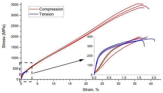 The apparent difference in Young’s modulus is not a real effect. During compression, samples whose height was greater than 1.5-fold the diameter were used. This value is the standard for compression specimens. In these samples, Young’s modulus cannot be correctly determined because of the presence of additional tangent stress. This stress results from the friction between the measuring table and the sample base. To eliminate this effect, samples with a height greater than 3-fold the diameter must be used. However, these samples are not suitable for determining the compression strength due to the buckling effect.