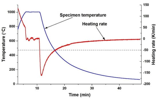 The literature data show that, in FeAl alloys at high temperatures, many vacancies (much more than in other metals) are formed. At the same time, the enthalpy of creating a vacancy is greater than or equal to the enthalpy of its migration. This situation means that there is a critical cooling rate. If the cooling rate is higher, thermal vacancies are not removed and remain in the material structure. The value of this critical rate is approximately 50 K/min. Figure 10 shows the temperature course during cooling of the sintered materials and the calculated heating rate. The cooling rate reaches its maximum value of approx. 150 K/min right after the start of cooling. The rate then decreases and exceeds the limit of 50 K/min when the system temperature is approximately 470 °C. At this temperature, several dozen hours are needed to remove vacancies. Therefore, the cooling rate of the PAIS process cannot eliminate thermal vacancies.