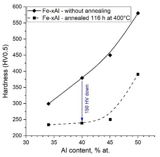 Alloys based on intermetallic phases have been intensively studied for several decades. The results of the first studies were very promising and indicated that alloys based on phases from the Fe–Al or Ni–Al system have the potential to replace expensive stainless steels in the industry [,]. However, to be practically applicable, in addition to many advantages, such as low density, good corrosion and oxidation resistance, and high strength at room and elevated temperatures, the phases from the Fe–Al system should also be characterised by good or at least reasonable ductility and impact toughness.
