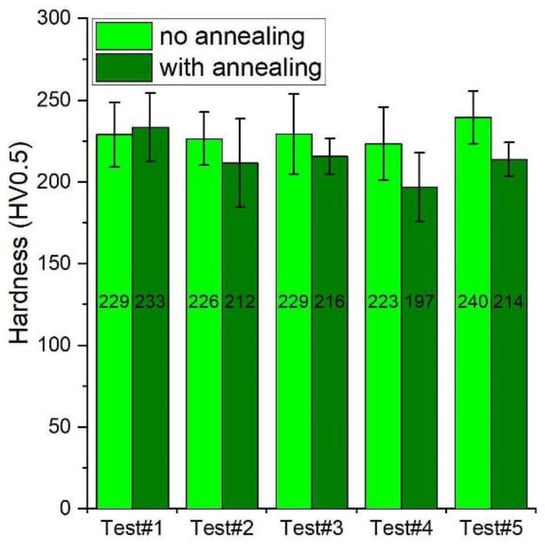 The method for eliminating thermal vacancies in the alloy is long-term (100 h or more) annealing at 400 °C. The result of this process is a significant reduction in microhardness, which is presented in Figure 11 []. The microhardness of Fe40Al before annealing was approx. 380 HV, while after removing the thermal vacancies, it decreased to approx. 230 HV (i.e., by 150 units). Five specimens were selected and subjected to Vickers hardness tests (HV0.5). Then, these samples were subjected to annealing at 400 °C for 160 h, and the hardness was measured again. The results are presented in Figure 12. The sintered materials without annealing have a hardness of approx. 230 HV. After long-term heating, the hardness decreases in all cases, but only slightly, by approximately 20–23 units. The statistical test (t-test) showed that only in the case of the last two samples was the difference in the obtained results statistically significant (Table 5). Samples 1–3 show differences within the measurement uncertainty.