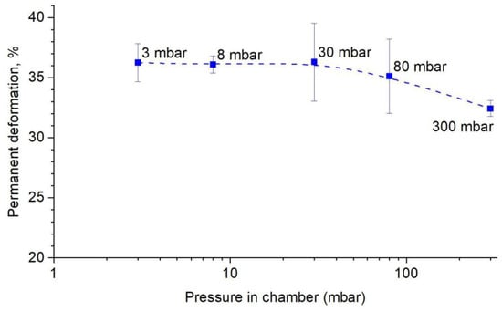 Figure 13 shows the change in permanent deformation as a function of pressure in the chamber during sintering. As seen, a pressure of less than approx. 50 mbar does not affect the deformation. The samples obtained at these pressures are characterised by a deformation of approx. 36%. The increase in pressure above the limit value causes a significant decrease in deformation to the level of approx. 32%. The effect of pressure is unsurprising, as the properties of the FeAl phase are known to be negatively affected by contact with oxygen from the atmosphere. Lowering the pressure during sintering reduces the partial pressure of oxygen with which the sample comes into contact and thus reduces the “damage” caused to the FeAl phase. The novelty is that, in the available literature, it has not been reported that the reduction of contact with oxygen would allow plastic deformation of the Fe40Al phase by several dozen percent.