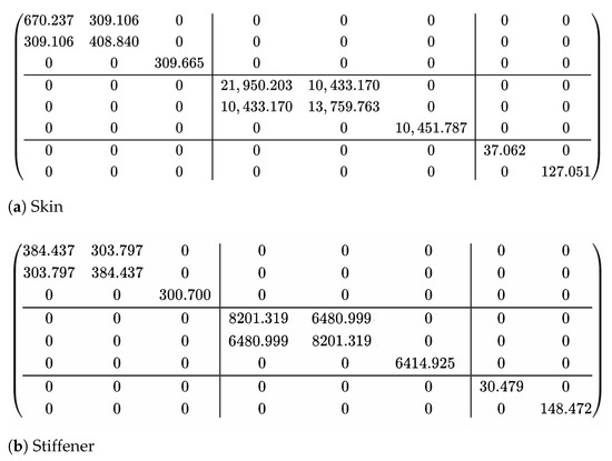 The structural parameters shown in Figure 4a were: l = 20 mm, h = 3 mm, and t = 1 mm. The OSFP is made of T300/7901 carbon/epoxy laminates. The layup configuration of skin was , and that of stiffener was . The lamina properties were: GPa, GPa, GPa, GPa, , , . The effective plate properties of the skin and the stiffener obtained by present model were given in Figure 5 for reference.