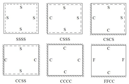 Six typical boundary conditions shown in Figure 6, including CCCC, CCSS and CSCS, CSSS, SSSS and FFCC, were used for static displacement analysis. The naming convention of boundary conditions is four letters, where S denotes simply supported constraint, C for fixed constraint, and F for free constraint.