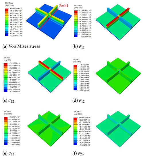 Figure 9 shows the local stress fields within the unit cell at the geometric center of the plate recovered from Equation (8) and the 3D Hooke’s law. It can be observed that the stiffeners played an important role in the process of load transfer, and there was a large stress concentration at the intersection of the stiffeners and the skin, showing a significant skin-stiffener effect. The stress distribution on the skin was relatively uniform, and there was no evident mutation. It was concluded that the stiffeners improved the bearing capacity of the panel, and the OSFP had a low weight and high strength compared to the ordinary panel.