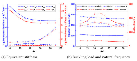 The layup configurations of the laminates would affect the effective performance of the OSFP due to the anisotropy and heterogeneity. In this section, the influences of the layup configuration on the equivalent stiffness, free vibrations, and buckling mode of the OSFP are analyzed. The layup configuration was set to , where increased from to at intervals. The boundary condition was fixed on one side and simply supported on three sides (CSSS).