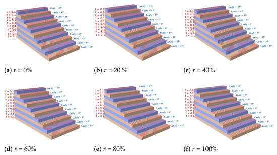 The ply ratio r was the ratio of the number of -ply to the total number of ply. To study the influence of -ply ratio on the effective performance of the panel, the 10-layered laminate with combination of and plies was considered, and the six layup configurations are illustrated in Figure 15.