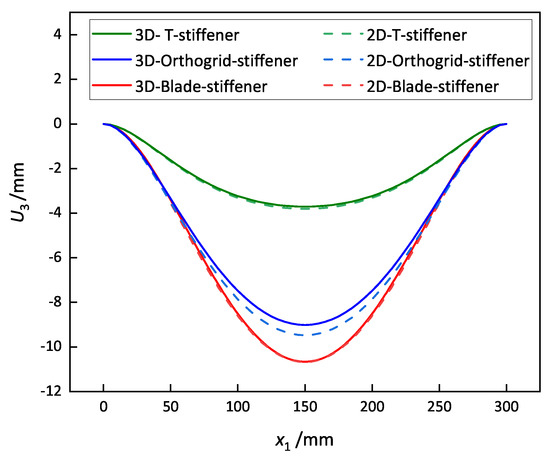 To verify the effectiveness of the 2D-RPM, a uniform load of 5 kPa was applied to the top surface of the OSFP, and the displacement distributions along Path 1 of the 3D-FEM and 2D-RPM were compared in Figure 7. The comparative results show that the displacement distributions predicted by the 2D-RPM were basically in agreement with those of the 3D-FEM. The differences were due to the different meshing methods used in the two models. The maximum displacement error under the CCSS boundary condition was the largest, but it was still within 5%. It is worth noting that the differences between the 2D-RPM and 3D-FEM in Figure 7c–e were much greater than other cases, which may be due to the gradual enhancement of boundary constraints from SSSS to CCCC. It was concluded that the 2D-RPM can predict the static displacement of the stiffened FRP panel with high accuracy and effectiveness, and the equivalent stiffness obtained from the VAM had sufficient accuracy.