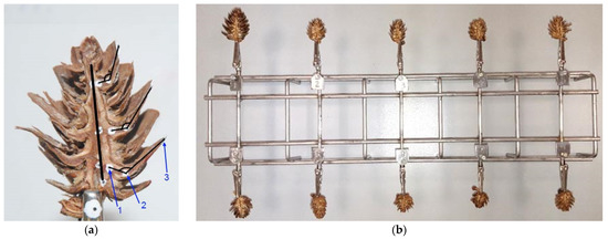 Scales for cellular structure examination were taken from the middle segment of cones with a moisture content of 5% and 20%. Cross-sections of the middle region of the scales were prepared as microscope slides (Figure 2a).
