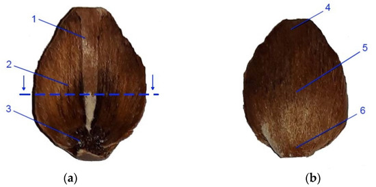 View of larch scale from the middle part of the cone: (a)—inner side (with the cross-section area marked): 1—wing area margin in the distal part of the scale, 2—wing area in the middle part of the scale, and 3 – seed depression in the proximal part of the scale; (b)—outer side: 4—distal part, 5—middle part, and 6—proximal part of the scale.