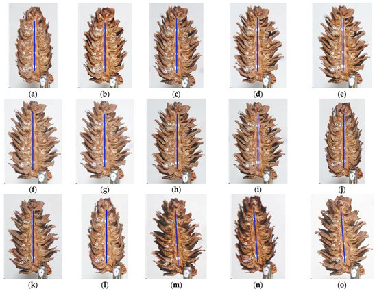 Subsequently, the cones were placed in a Heraeus UT612 circulating air oven (Kendro Laboratory Products GmbH, Hanau, Germany). The drying air temperature was set to 35 °C for the first two hours and then increased to 50 °C for another six hours. Every hour throughout the process, the stand was taken out of the oven and individual cones were photographed using a Nikon D3000 camera (Nikon, Tokyo, Japan) with an AF-S DX NIKKOR 18–105 mm f/3.5–5.6G ED VR lens. The cones on the stand were photographed against a white background with a Modeco MN 85-001 manual Vernier caliper (Modeco Expert, Wrocław, Poland), which served as a measurement reference for scaling. Images acquired at a focal length of 105 mm and an aperture of f = 5.6 were saved in JPG format at a resolution of 3872 × 2592 pixels. The distance between the cones and the lens was 350 mm.