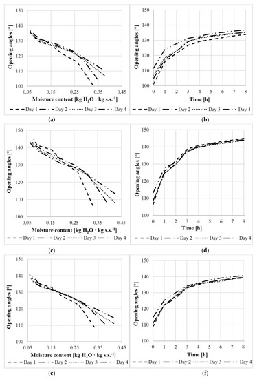 Relationship between the scale opening angle and moisture content/process duration for scales obtained from the base (a,b), middle (c,d), and apex (e,f) of cones.