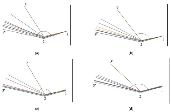 For the first day, also a linear function was calculated (2) with the following opening angles: , , , , , , , , and . The opening angle increased rapidly from the initial state up to 4 h on the first day (by 29.76°), and then slowly from 4 h to 8 h—on average by 3.16°.