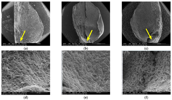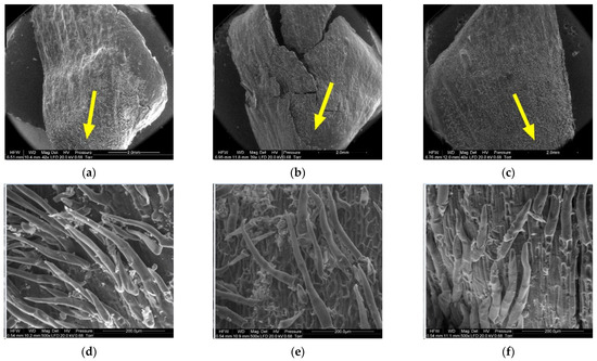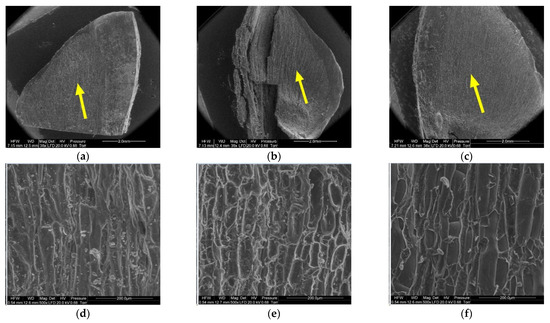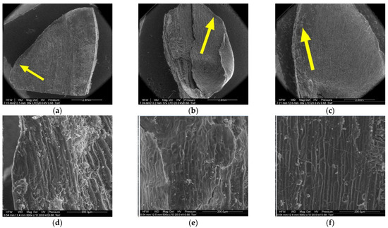 Inner side of larch scale. Seed depression area: (a) MC = 20%, zoom 50×; (b) MC = 10%, zoom 50×; (c) MC = 5%, zoom 50×; (d) MC = 20%, zoom 500×; (e) MC = 10%, zoom 500×; and (f) MC = 5%, zoom 500×.