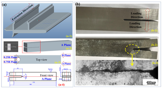 The commercial 6005A-T6 aluminum extrusion profile for the frames of high-speed trains—the composition and the schematic diagram of which are presented in Table 1 and Figure 1a, respectively—was utilized in the present study. Based on our previous works [1,2], it is understood that pitting and intergranular corrosion along the extrusion direction would be the most serious. Thus, it would be essential to the estimate/investigate the SCC resistance along the deformation direction. Based on the national and international standards “GB/T 12455.1-1990 High-Strength Alloys—Method of Stress Corrosion Test for Double Cantilever Beam (DCB)” and “ISO/DIS 7539-6:2018 Corrosion of Metals and Alloys—Stress Corrosion Cracking—Part 6: Preparation and Use of Pre-cracked Specimens for Tests under Constant Load or Constant Displacement”, the pre-cracked self-stressed DCB specimens along the extrusion direction were fabricated, the schematic diagrams of which are presented in Figure 1a,b-1. These two free surfaces are referred to as A-Plane and B-Plane, respectively. After the SCC test, the DCB specimen was cut at the quarter positions referring to the surfaces, which are referred to as 0.25B plane and 0.75B plane, respectively.