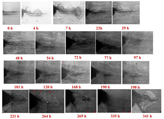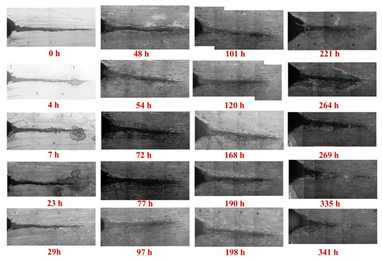 Figure 2 and Figure 3 display the crack propagations in the A-plane and the B-plane, respectively, of the pre-cracked self-stressed DCB specimen characterized by OM. There are several advantages of the pre-cracked DCB specimens [27]: Firstly, they obviate the need to wait for a corrosion pit to grow, saving time. Secondly, they enable one to avoid an erroneous conclusion of immunity to SCC because of a non-pitting combination of alloy and environment. Thirdly, they enable one to obtain a conservative evaluation by evaluating the material in the presence of the ultimate flaw—namely, a sharp crack. Fourthly, if the specimen meets certain criteria, the methods of fracture mechanics can be used to predict, from the behavior observed in one geometry of specimen and crack, what will happen in other geometries. Accordingly, the measured steady-state crack propagation rate at stage II of the A and B surfaces is 5.88 × 10−7 mm/s and 6.09 × 10−7 mm/s, respectively, while the stress intensity factor of SCC (KISCC) is 177.9 MPa m1/2 and 85.4 MPa m1/2, respectively.