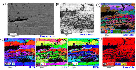 Furthermore, the pitting and IGSCC cracking features in the 0.75B plane were characterized by EBSD to reveal the fundamental reasons for the pit-to-crack transformation, as shown in Figure 8. We found that those main cracking paths are almost all along the PFZs, while the pits occur with a lot of discontinuous precipitates nearby. The heterogeneous structures composed of a series of hardening precipitates and solute clusters initiated localized corrosion at the secondary phases or their surrounding Al matrix, forming pits and beginning the degradation of the mechanical properties of the alloy [1]. The correlations between the microchemistry of grain boundary precipitates (GBPs) and SCC resistance have been widely investigated [13,14,30,31,32]. It is understood that precipitates usually have a composition different from that of the matrix, yielding a local chemistry change [1,33]. The corresponding electrochemical properties, including pitting corrosion and stress corrosion cracking, are detrimentally affected by PFZs [1,33]. In particular, some solute atoms could increase the corrosion resistance of Al–Mg alloys by promoting the formation of competitive GBPs and retarding the growth kinetics of the β-phase, resulting in better IGSCC resistance than those alloys consisting primarily of the β-phase [32]. Therefore, GB engineering would be an efficient approach, as it not only improves the mechanical properties of Al alloys, but also enhances their corrosion resistance.