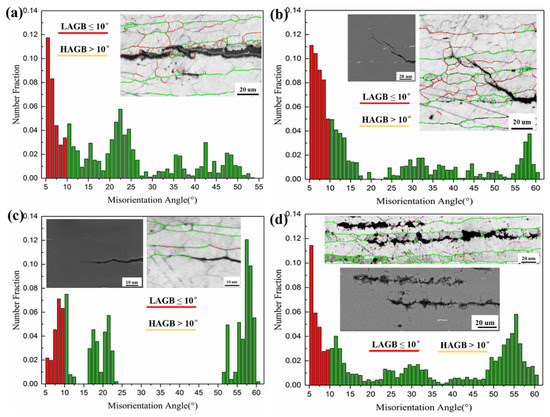 Based on those characterizations in terms of OM, SEM, and EBSD discussed above, it is apparent that GBs play an important role in the IGC, IGSCC, and SCC. Taking advantage of the Euler angles obtained via EBSD analysis, the GB misorientation statistics can be completed conveniently [2,34]. As presented in Figure 9, the statistics of high-angle grain boundaries (HAGBs) and low-angle grain boundaries (LAGBs) for the selected regions of the DCB specimen were compared. It can be seen that the main dominated crack growth path is along the HAGBs parallel to the extrusion direction, as shown in Figure 9a. At the cracking tips, it appears that there are a great number of precipitations segregating at the HAGBs, avoiding the crack propagation along the original main cracking path and resulting in failure to follow Schmid’s law, with the maximum shear stress along this slip plane, as displayed in Figure 9b. It is understood that the GBPs generally have a higher corrosion potential than the Al matrix, thereby acting as the cathode in the microgalvanic reaction [20]. The 6005A extrusion profiles with elevated copper content demonstrated IGC susceptibility due to the presence of GBPs that are cathodic relative to the PFZ [20]. On the other hand, the HAGBs match exactly the dominant cracking propagation in Figure 9c,d. While a great amount of LAGBs are located at the unattached regions, the networks of HAGBs hint at their significant contributions to IGC and IGSCC [2]. Similarly, it has been reported that there is a direct relationship between IGC and SCC, which has also been observed in 5XXX, 6XXX, and 7XXX alloys [20]. These observations suggest that the metallurgical and environmental conditions that promote IGC in 6005A extrusions also promote SCC [20].