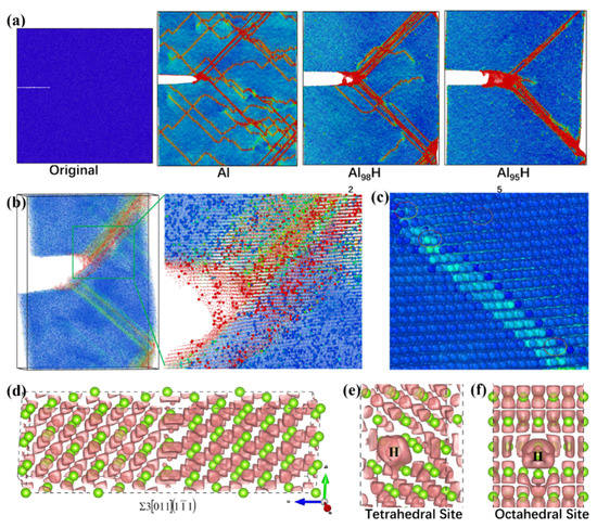 The atomic and electronic bases for the hydrogen-assisted cracking of Al [4,35]: (a) the effect of hydrogen on the deformation behavior and crack propagation of Al, Al98H2, and Al95H5 under axial tension at a strain rate of 1 × 10−9 s−1; (b) the trapped hydrogen-activated crack propagation and slip of Al98H2 presenting a clear contrast by enlarging the atomic radii of H atoms relative to those of Al atoms; (c) the trapped hydrogen at the tip of the dislocation; (d) the bonding charge density of GB of Al; (e,f) hydrogen embrittlement for the tetrahedral and octahedral occupations, respectively, at the GB. The von Mises strain in (a–c) was utilized to present the blue–green–red (BGR) gradient colors, with minimum and maximum values of 0.001 and 0.9, respectively.