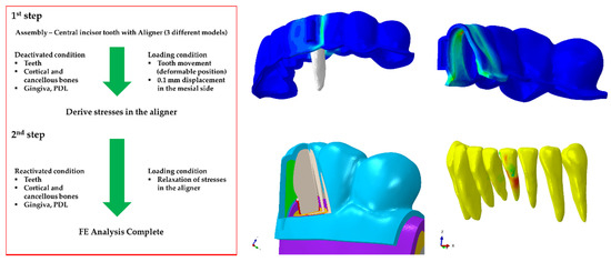 The birth and death FE analysis method described by Zhou et al. [35] was employed in the loading and boundary conditions of this study. The simulation analysis was divided into two processes (Figure 3). In process 1, the aligner treatment planning was performed; in process 2, the actual aligner correction process was realized. In process 1, only the teeth and aligner were analyzed. The teeth were treated as rigid bodies, whereas the aligner was treated as a deformable body. The inside surface of the deformable aligner was “tied” to the rigid teeth and a 0.1 mm displacement in the mesial direction was applied through the center of rotation of the central incisor. The remaining teeth were constrained in all directions of motion. The displaced central incisor, remaining teeth, and the deformed aligner were then exported to process 2. The imported deformed aligner created a mismatch with the deformable teeth of the dental arch.
