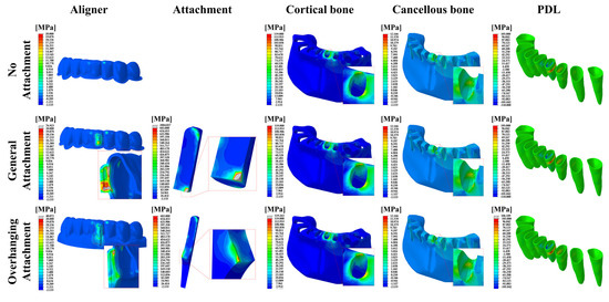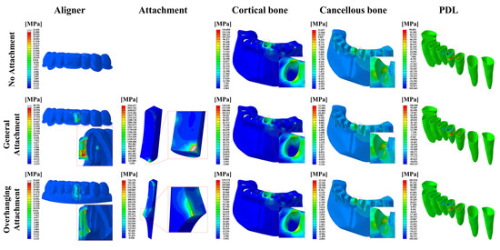 FE results of the stress distribution for the component of the orthodontic treatment model in the 0.75 mm aligner models. The aligner and attachment were expressed as PVMS values, and the bones (cortical and cancellous) and PDL were expressed as MPS values.