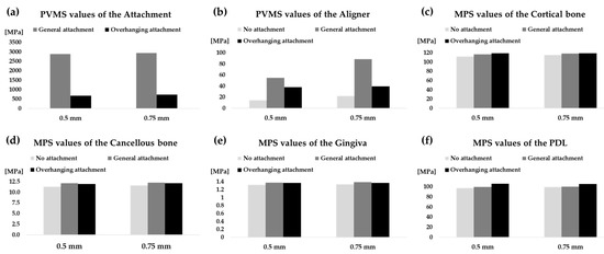 PVMS values measured in the aligner and attachment, and MPS values measured in the cortical bone, cancellous bone, gingiva, and PDL for both 0.5-mm and 0.75-mm-thick aligner models. (a) Attachment; (b) aligner; (c) cortical bone; (d) cancellous bone; (e) gingiva; (f) PDL.
