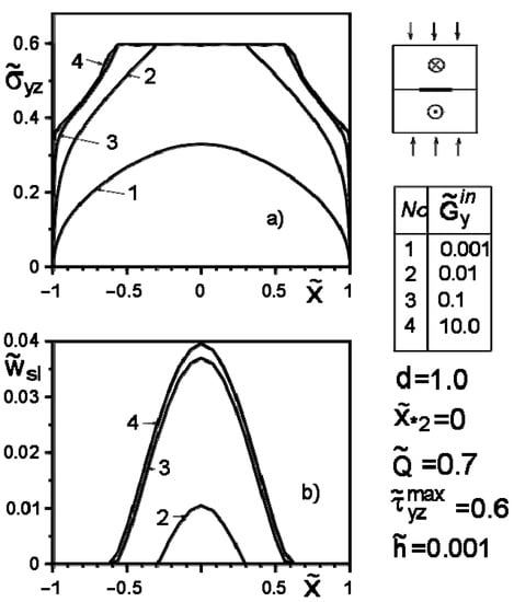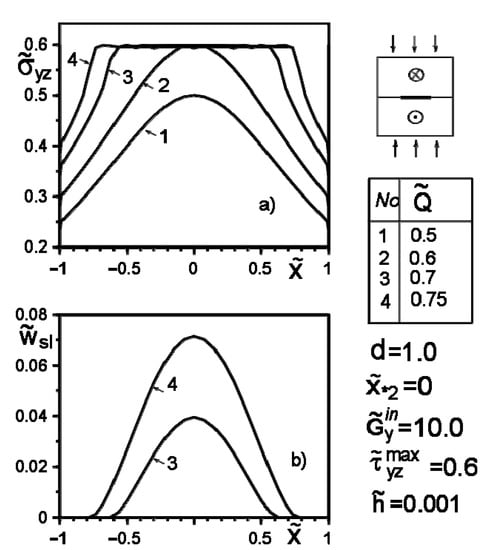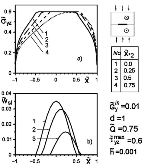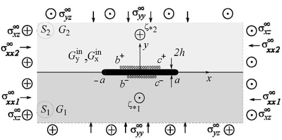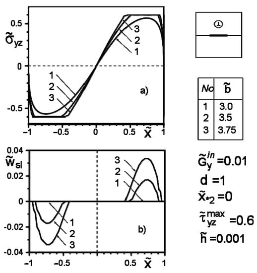 where and are the variable shear moduli of the inclusion material. Taking them to be constant, we obtain a special case of Hooke’s law. Hereinafter, the following notations are used: and ; the indexes “+” and “−” correspond to the limit values of functions at the upper and lower edges of the line .