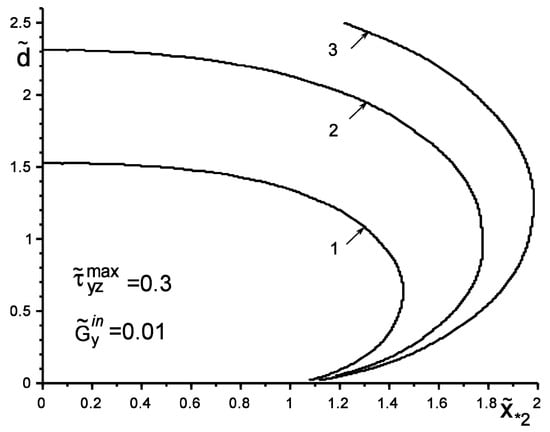 The boundary of the “safety zone” when loading the structure with a softer than the matrix inclusion by a concentrated force: 1—; 2—; 3—.