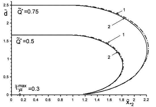 Figure 2 and Figure 3 show the results of the study of the “safety zone” for the intensities and coordinates of concentrated forces , where , . The “safety zone” for a concentrated factor of a certain value will be understood as the coordinates of its application at which slippage does not yet start at any point of the boundary ; i.e., condition (4) is not fulfilled. We define the boundary of the “safety zone” from the following criterion: condition (4) starts to be fulfilled at least at one point. It can be argued that an inclusion harder than the matrix changes the form of the “safety zone” much less than a softer one. The particular case of no inclusion shows the coincidence of the results with those obtained in [,,]. Additionally, note the expected trends of linear dependence of the growth of the critical value on the increase in the value , as well as on the increase in the distance of the points of application of the concentrated force. These effects are especially appreciable for the “soft” inclusion, when .