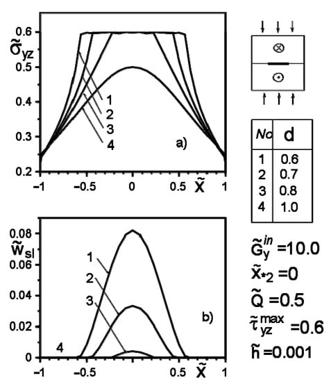 Along the segment is a thin inclusion of thickness (Figure 1), of which the upper and lower banks may come in contact with the matrix non-ideally on the intervals , respectively. and are the shear moduli of the inclusion material. The upper index “in” denotes the values describing the inclusion material’s SSS.