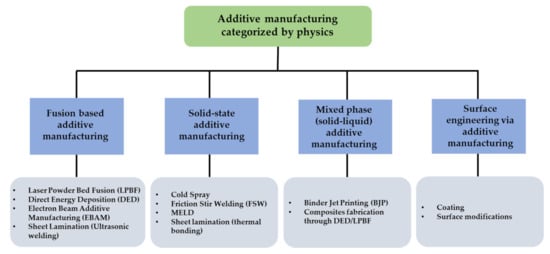 AM is revolutionizing more and more from rapid prototyping to agile manufacturing applications [10]. It requires in-depth insight into the process and the microstructural features as an outcome of the process parameters, and it renders unique properties to the additively printed parts. Various AM processes for metals are based on the fundamental concept of layer-wise material deposition. However, each processing technique has unique and distinct physical phenomena due to the energy source, operating conditions, precursor materials, and mechanisms involved in metallurgical consolidation [11]. During the metallic AM process, the materials in use encounter complex thermokinetics that involve a combination of directional heat extraction, molten pool dynamics, rapid solidification, and repeated cycles of heating and cooling. These factors influence the physical integrity of the AM component and microstructure with peculiar properties different from conventionally processed parts [12]. All these aspects affect the mechanical and chemical properties of the printed components. Thus, it is essential to recognize the categorization of different AM processes based on the physics associated with each AM process during the fabrication of a component (Figure 1 and Figure 2).